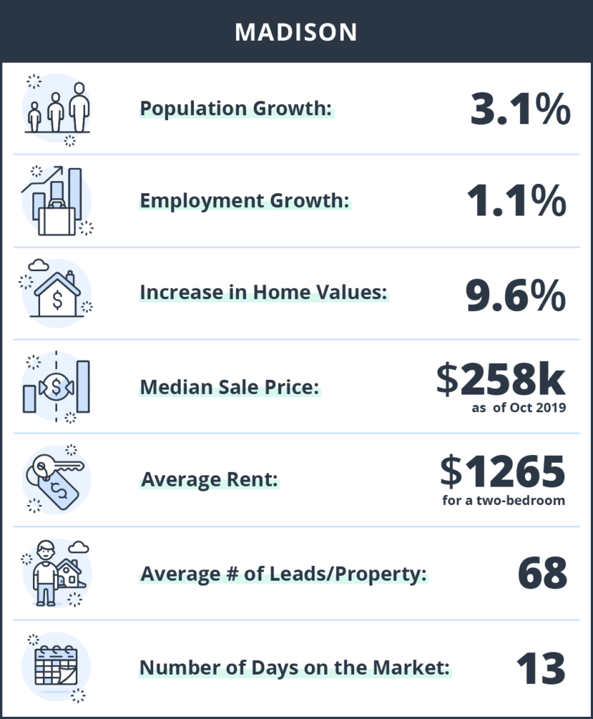 In this edition of The TurboTenant report, we will be focusing on the best places to buy an investment property in Wisconsin. Four towns made our list: Madison, West Allis, Kenosha, and Manitowoc. We curated data from studies on the best places to buy an investment property, median listing price, and proprietary TurboTenant data. The TurboTenant Data includes stats on the average number of leads a rental property received, as well as the average number of days on the market. These two points will help an investor determine the strength of the rental market, as well as estimating potential vacancy rates.