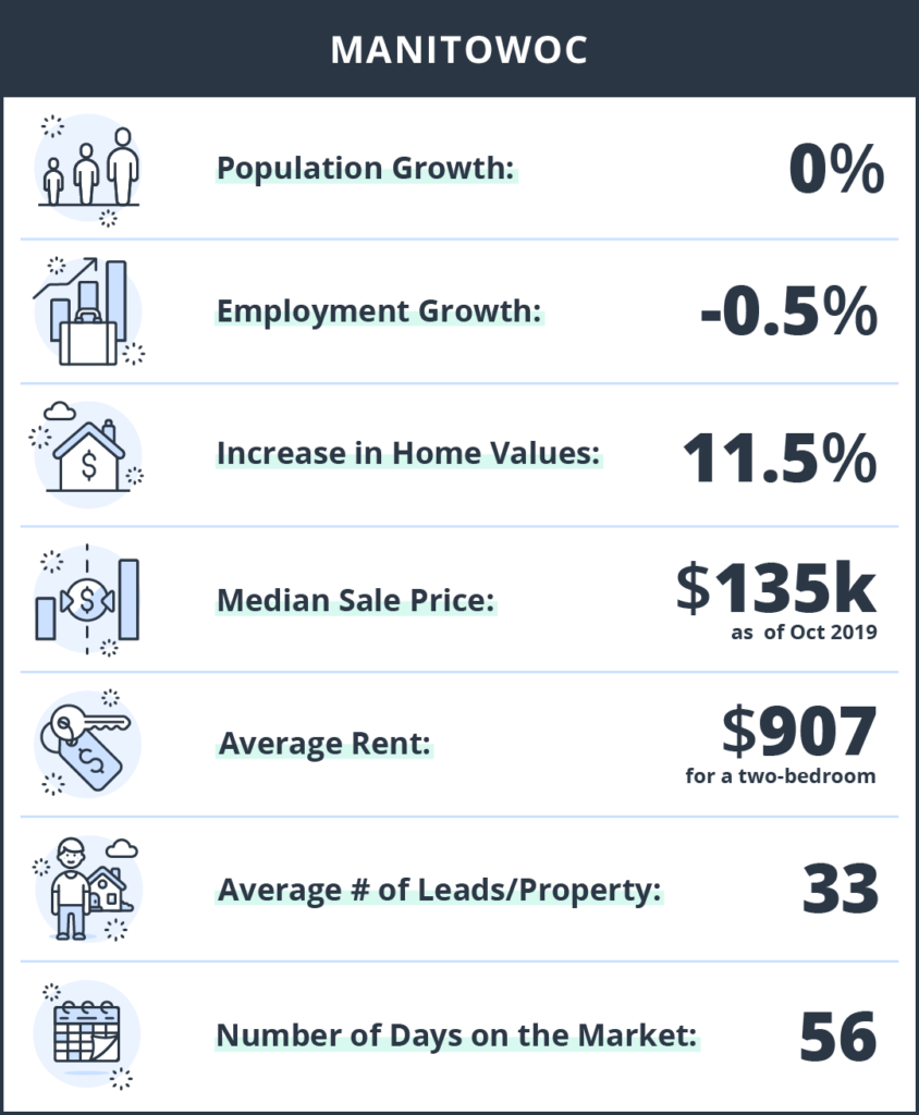 Manitowoc is the Maritime Capital of Wisconsin and also home to the Wisconsin Maritime Museum. The city is located on Lake Michigan at the mouth of the Manitowoc River. Manitowoc is claimed to mean “dwelling of the great spirit.” This charming town has over 13 miles of walking and biking trails along Mariners Trail, as well as a multi-million dollar full-service marina complex on its shores. Thankfully, you won’t have to pay a million dollars for a rental property in this quaint town, the median listing price is coming in at $135k with a strong average rent reported at $907. Home values are on the rise as well, increasing 11.5% year over year. Landlords are getting 33 leads per property on average, with around 56 days on the market. Manitowoc’s got spirit, yes they do.