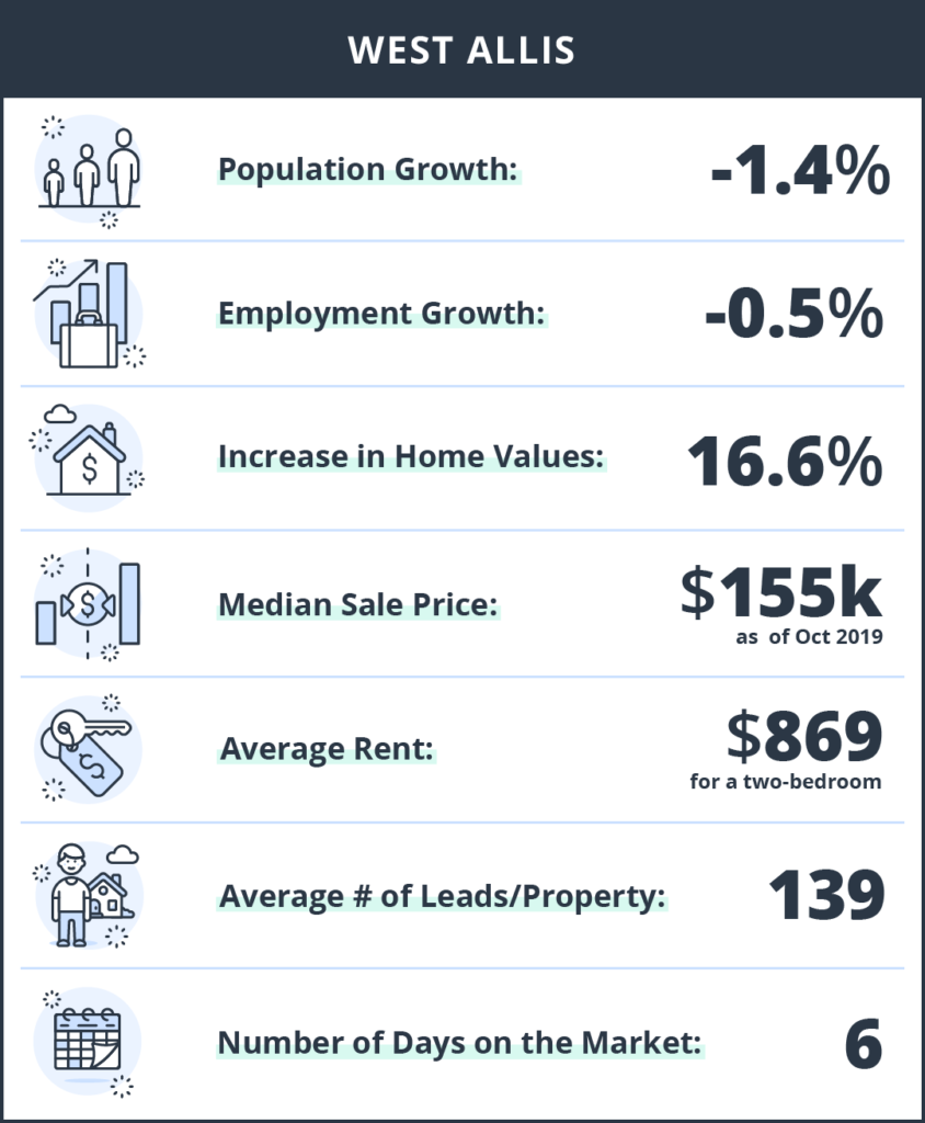 West Allis is a suburb of Milwaukee, the reported population as of 2010 was roughly 60k. West Allis has it all – great dining, community sponsored events, bike-friendly streets, rich history, fine arts, and the Wisconsin State Fair. It also wins for the highest number of leads per property at 139, and less than a week on the market. Population and employment growth saw slight declines, home values did not, with a 16.6% increase year over year. Continuing with the affordable trends in Wisconsin, the median listing price is $155k with an average rent price of $869.